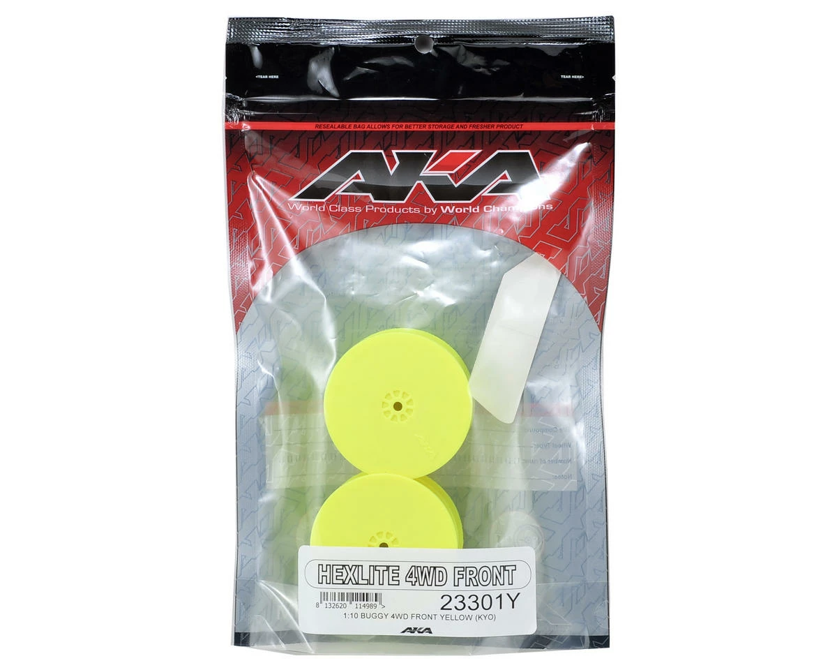 This is a set of two AKA Racing “HEXlite” 2.2 4wd Front Wheels, and are intended for use with Kyosho Lazer ZX5 4wd 1/10 buggy. How do you reinvent the wheel? Make it lighter and more durable! AKA HEXlite 1/10 buggy wheels were designed with two things in mind, weight and durability. Both were achieved through superior engineering and use of AKA’s proprietary high-impact nylon. This combination makes them one of the lightest hex wheels on the market. Plus, HEXlite wheels spin true and balanced thanks to the “made in the U.S.A” quality craftsmanship. Also, a revolutionary feature to the 1/10 market is the optional wheel stiffener insert (Not Included). It has been designed to stiffen the already stiff wheel, as well as help prevent dirt from building up inside the wheel, which will cause the wheel to go out of balance.