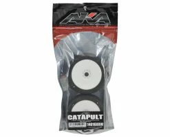This is a pack of two AKA Racing Catapult 1/8 Buggy Tires, pre-mounted on white EVO wheels. The 1/8 Catapult is engineered to offer a balance of life and traction on dusty abrasive tracks. The larger lugs minimize wear, while the “C” shaped treads dig through the dust to find grip.