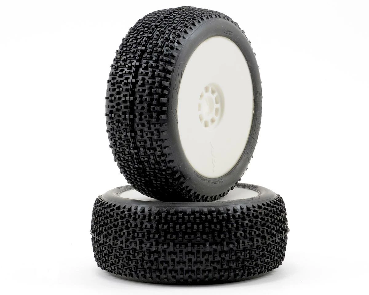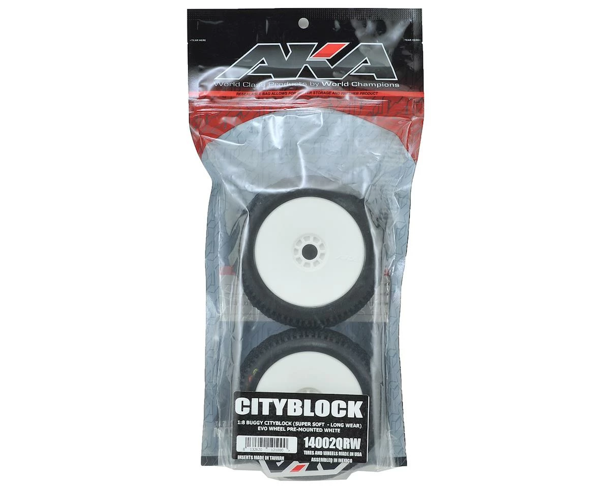 This is a set of two AKA City Block 1/8th scale off-road buggy tires, pre-mounted on white EVO wheels. AKA’s R-Line pre-mounts feature AKA’s World Championship winning EVO wheel, and when combined with the stiffener disc (34003Y or 34003W), is the most technically advanced wheel available. The R-Line pre-mount also features AKA’s soft red insert (34001S) which was also used by Cody King to win the 2010-2011 1/8 Buggy IFMAR World Championships. Combine these two revolutionary products with the quality and endurance of AKA tires and the result is the most technically advanced pre-mounted tires ever offered for 1/8 Buggies.