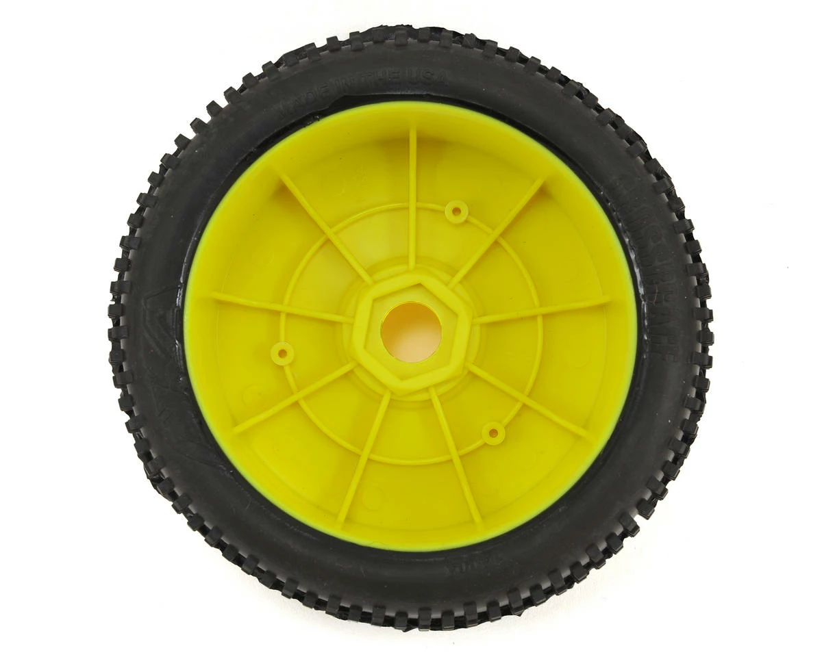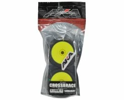 This is a set of two AKA Crossbrace 1/8th scale off-road buggy tires, pre-mounted on yellow EVO wheels. AKA’s R-Line pre-mounts feature AKA’s World Championship winning EVO wheel, and when combined with the stiffener disc (34003Y or 34003W), is the most technically advanced wheel available. The R-Line pre-mount also features AKA’s soft red insert (34001S) which was also used by Cody King to win the 2010-2011 1/8 Buggy IFMAR World Championships. Combine these two revolutionary products with the quality and endurance of AKA tires and the result is the most technically advanced pre-mounted tires ever offered for 1/8 Buggies.
