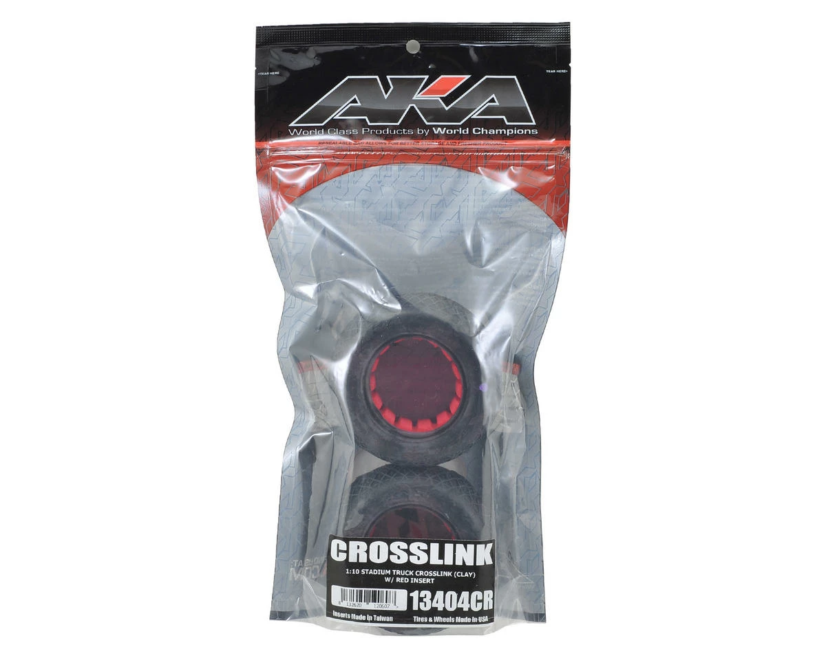 This is a pack of two AKA Crosslink 2.2″ Off-Road Truck Tires with included red inserts. The Crosslink features a symmetrical open tread pattern designed to break in quickly and provide unmatched forward traction. This additional forward traction is perfect for today’s high powered 1/10 stadium trucks and allows a more aggressive steering setup without the worry of losing on-power control. The Crosslink has been designed for hard packed or blue groove, indoor and outdoor tracks. Available in championship winning Clay, Ultra Soft and Super Soft compounds with Red inserts.
