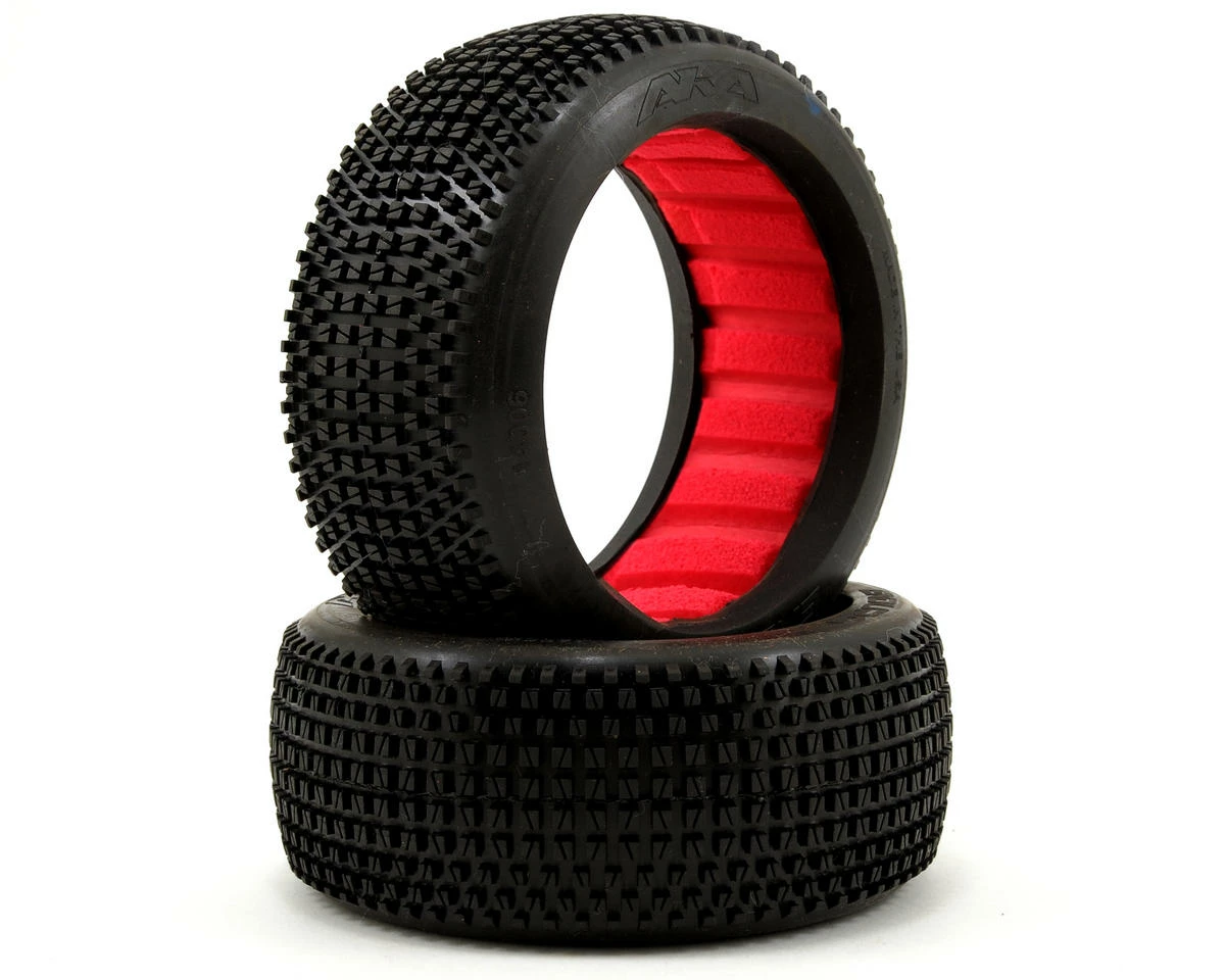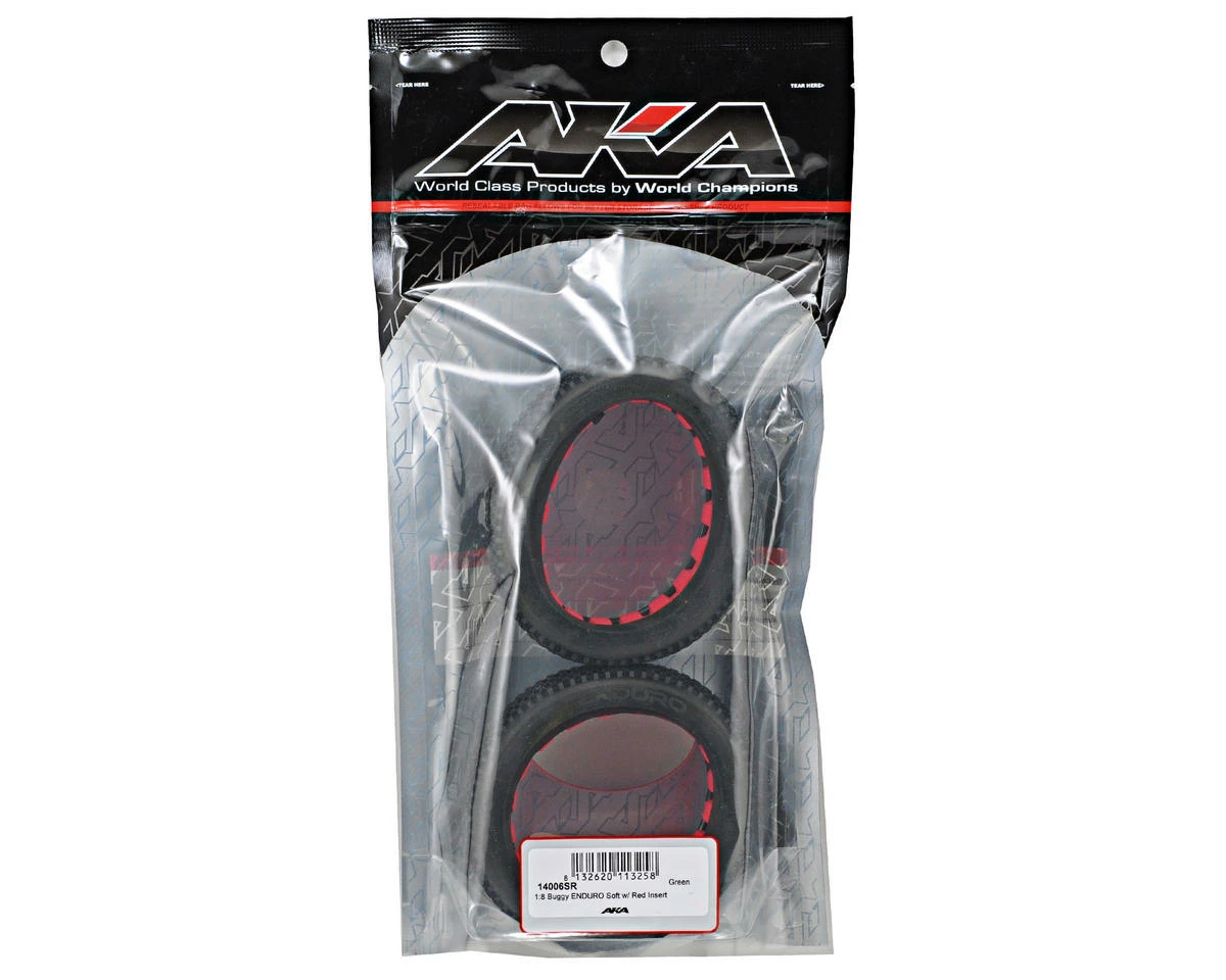 This is a set of two AKA Racing Enduro 1/8 Buggy Tires. These tires include AKA Red inserts. The ENDURO was designed with larger lugs that have been cut in various angles to provide you with great tread life but also give the lugs enough flex to give you the bite you need on a variety of different track conditions.