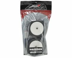 This is a set of two AKA Racing EVO Grid Iron 1/8 Truggy Tires, pre-mounted on white EVO wheels. The Gridiron tire is designed for tracks that are hard packed and or tracks with little dust. This tire design is a great outdoor or indoor alternative. The square outer pins and bar center pins allow for great traction and long tire life compared to other small pin tires. The EVO version of the Gridiron has been revised with more tread density for better performance and wear characteristics.