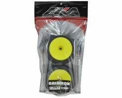 This is a set of two AKA Racing EVO Grid Iron 1/8 Truggy Tires, pre-mounted on yellow EVO wheels. The Gridiron tire is designed for tracks that are hard packed and or tracks with little dust. This tire design is a great outdoor or indoor alternative. The square outer pins and bar center pins allow for great traction and long tire life compared to other small pin tires. The EVO version of the Gridiron has been revised with more tread density for better performance and wear characteristics.