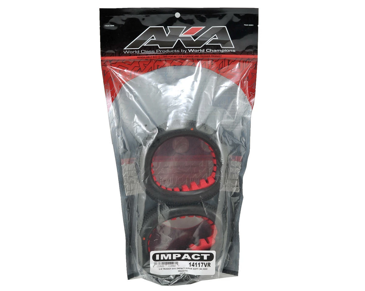This is a set of two AKA Racing EVO Impact 1/8 Truggy Tires. The Impact tire features a dense small square lug pattern with offset lug rows in the center of the tire to deliver maximum forward traction and good wear characteristics. The two outer rows of lugs are parallel to create a circumferential groove at the edge of the tire to give the tire very predicable side bite. This allows the car to rotate in the center of the turn while still feeling very stable and predictable.