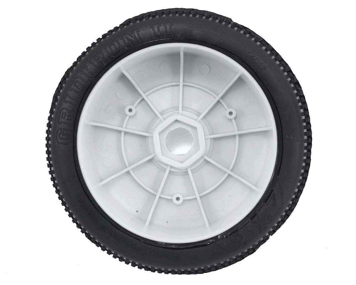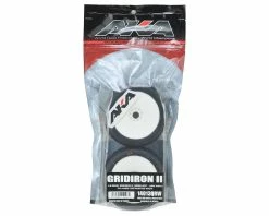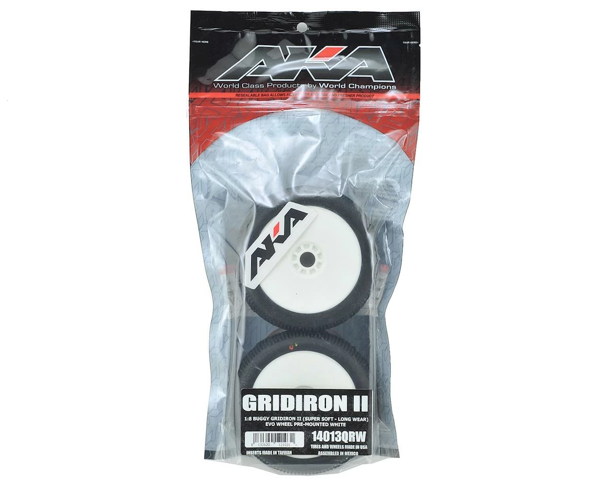 This is a set of two AKA Racing Grid Iron II 1/8 Scale Off-Road Buggy Tires, pre-mounted on white EVO wheels. The Grid Iron II uses the same carcass as the World Championship winning Impact tire, with the addition of added waffle ribbing to help control tire expansion and angled side pins for better performance on rougher tracks. This created a tire that is 5% lighter than the original, with improved improving acceleration and all-around performance.