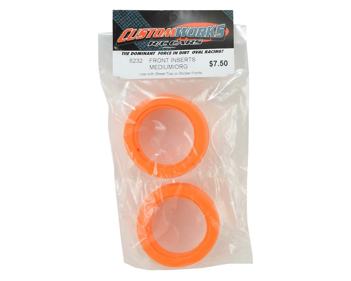Custom Works Front Molded Insert. These are the medium density orange front tire inserts. This is a great match to the Rear Insert (CSW6236) used with the Sticker and Street Trac rubber tires. These now come standard in the premounted front tires. Package includes two inserts.