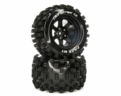 This is a pack of two pre-mounted DuraTrax Faze MT 2.8″ 2WD Stadium Truck Tires, compatible on the front and rear with most Arrma 3S BLX vehicles that use a 14mm hex.