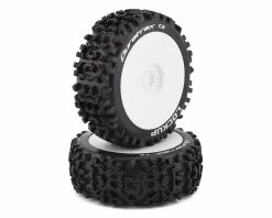 This is a set of two DuraTrax Pre-Mounted Lockup 1/8 Buggy Tires in C2 compound. These tires are recommended for loose and wet track conditions, as well as grass tracks. DuraTrax Performance Tires deliver top-end traction and durable construction so you can keep running laps, long after your competition has limped to the pits. DuraTrax wheels feature a unique “star” pattern hub that grips the nut better than traditional styles.
