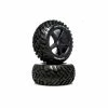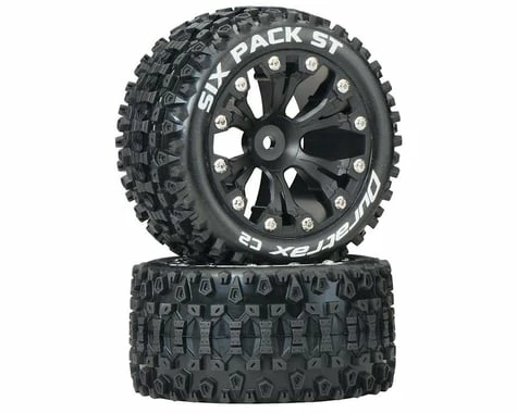 Duratrax 2.8″ diameter stadium truck tires are available mounted in your choice of black or chrome 6-spoke rims. All are sold in pairs and include foam inserts.