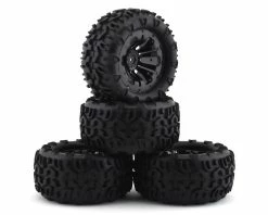 Firebrand Terrafire MTX Pre-Mounted Off Road Tires are an off-road wheel and tire option that does it all. Not only will they fit your Slash™, Stampede™ AND TRX-4™ – they’ll fit just about ANY 1:10 scale, off-road RC vehicle. At 2.9 inches, these wheels will clear the larger suspensions while the tires maintain a lower-profile stance. Lowering your vehicles center-of-gravity also provides less roll and more traction in extreme situations. Mud, dirt, grass, sand, or snow – Fracker directional treads dig and dig through the slickest bogs you can create. Fracker tires guarantee more control during major acceleration. Plus, you’ll get even more traction from the deep off-set hubs that extend the tire out further from the chassis. Made from the highest quality, nylon-spun plastic available. (Set of 4, Pre-glued) Wheel size with tire is: 2” (55mm) x 4.5” (115mm) with 12mm, hex-fit hubs.