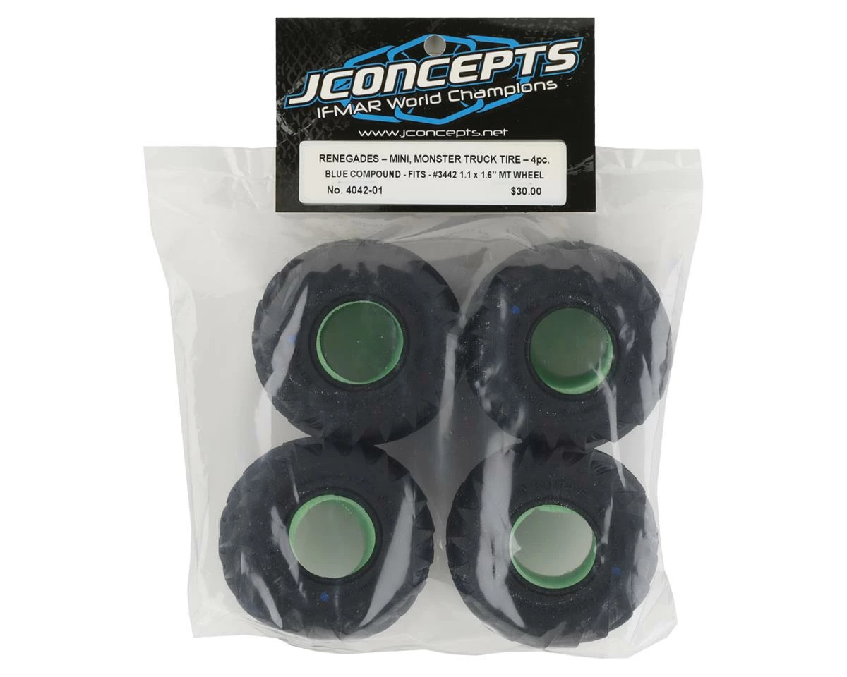 This is a set of JConcepts 1.1″ Renegades 1/24 Mini Monster Truck Tires. Scaled from the popular JConcepts 5.6″ Renegade tires these feature chevron style lugs with specially designed back-cut tread and shaved carcass areas imitating a full size monster truck. The low-profile stance of the Renegades stays very flat during race course competition, speed-runs or general use. The tire carcass profile holds the weight extremely low while the design of the tire beads allows just the right amount of contact patch for gluing and application. Overall these are an excellent addition to your next 1/24 monster truck build.