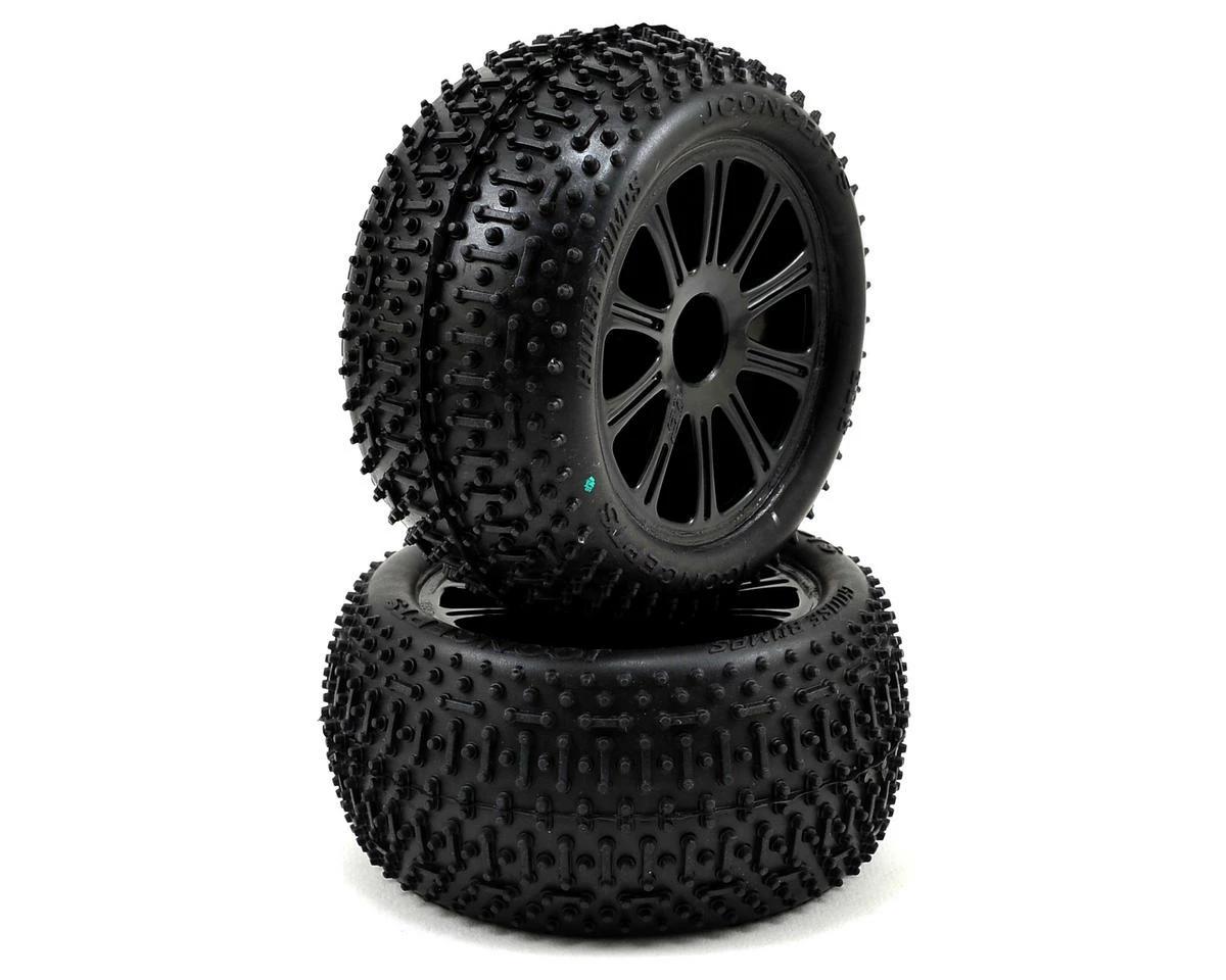 This is a pack of two JConcepts Goose Bumps Tires in green compound, Pre-Mounted on black Rulux Wheels. The traction and performance of the Goose Bumps is a known commodity. Now, it can now be added to the wildest 1/16th scale truck on the market. Bring the performance of the 1/16th E-Revo up to speed and hit the easy button with JConcepts.