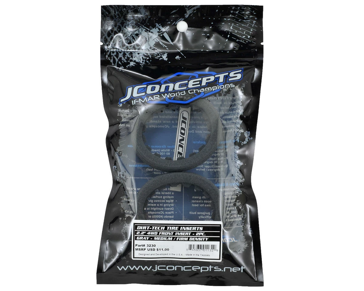 This is a pack of two JConcepts Dirt-Tech 1/10 4WD Buggy Closed Cell Front Inserts. JConcepts has upped the ante with the Dirt-Tech closed cell inserts. Gray in color, these inserts were developed in conjunction with tire insert guru, Brian “Dirt” Kinwald to deliver incredible performance, while at the same time providing the durability that racers demand.