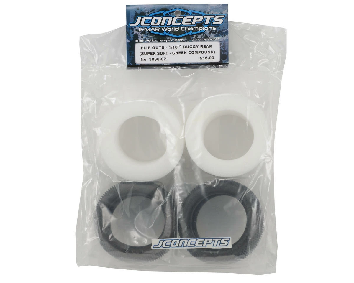 This is a set of two JConcepts Flip Outs 2.2 1/10th Rear Buggy Tires. It’s not just a name; it’s a driver’s reaction! Flip Outs offer drivers a tire that is in-between Goose Bumps and Double Dees. Small pin construction makes up the foundation for the Flip Outs design and provides grip when racers need it most. When the conditions are wet and green in the morning, traction is sometimes hard to come-by; Flip Outs are the new choice. Â