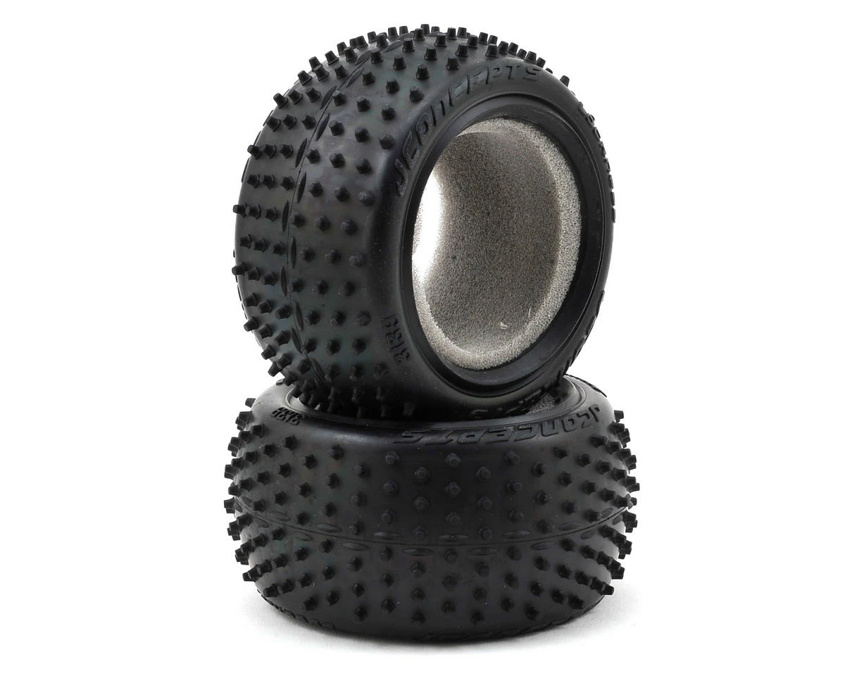 The spread out nature of the pin design allows incredible forward traction and the low-profile construction allows the driver to push hard at all times. The pink compound marked with 2 pink dots is a medium soft material with good wear characteristics. The rear tires include gray, open cell inserts making them a complete set ready to mount, straight out of the package.