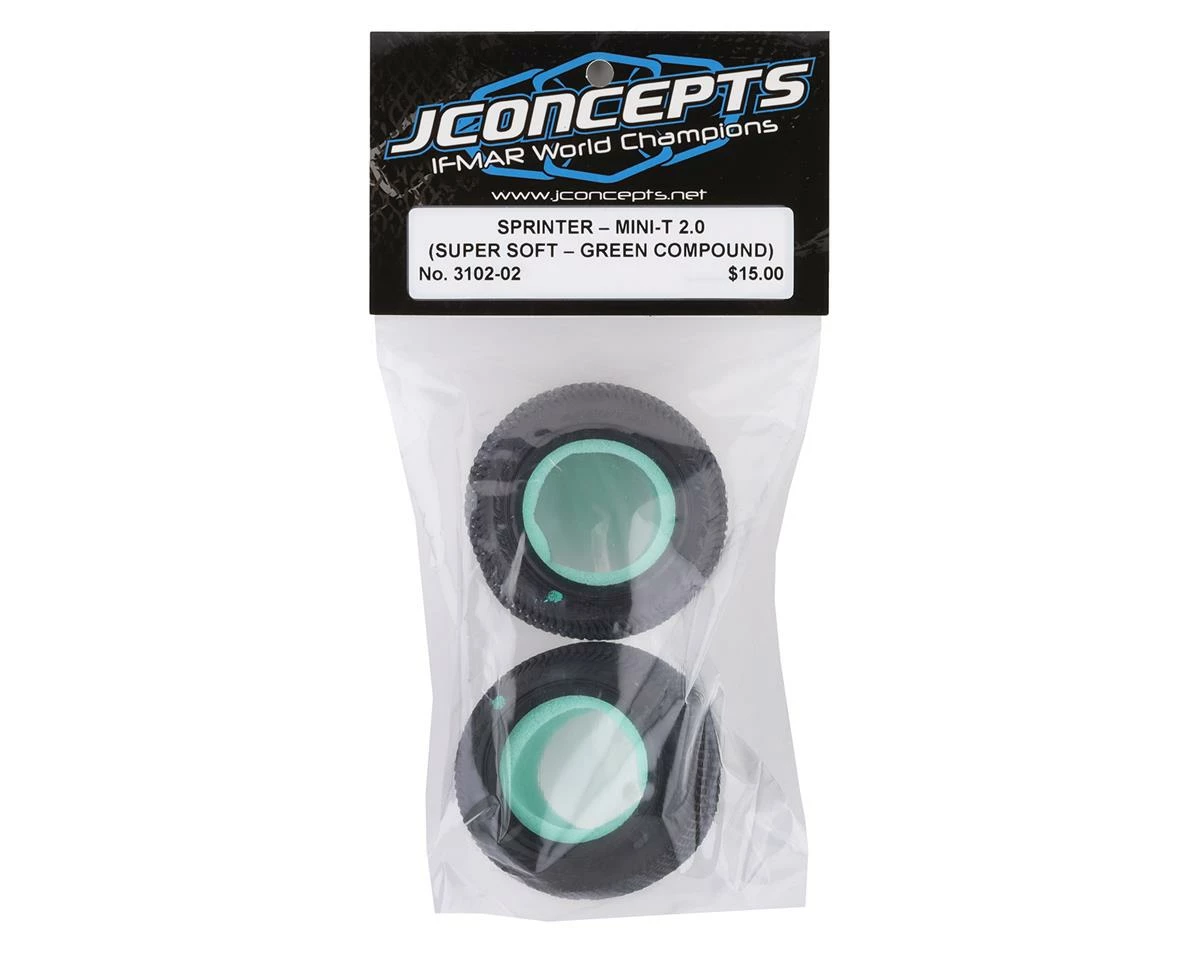 This is a pair of JConcepts Mini-T Sprinter Off-Road Tires in Green super soft rubber compound. The Sprinter tire has square, angled pins that are stacked vertically to flex and fold evenly across the tire. Typically, a stacked tread will wear less and provide more forward bite while the aligned space helps rotation in the turns and gives a snappy release to square up quickly. Starting with the tread, the team focused on durability and performance to bring a rear tire option to market that competes on loose surfaces which are wet or dusty.