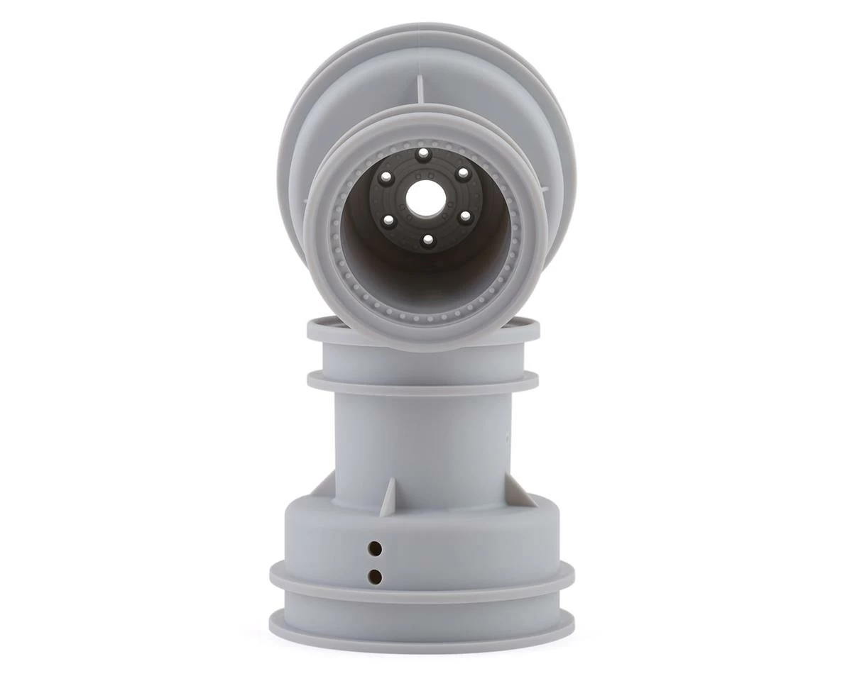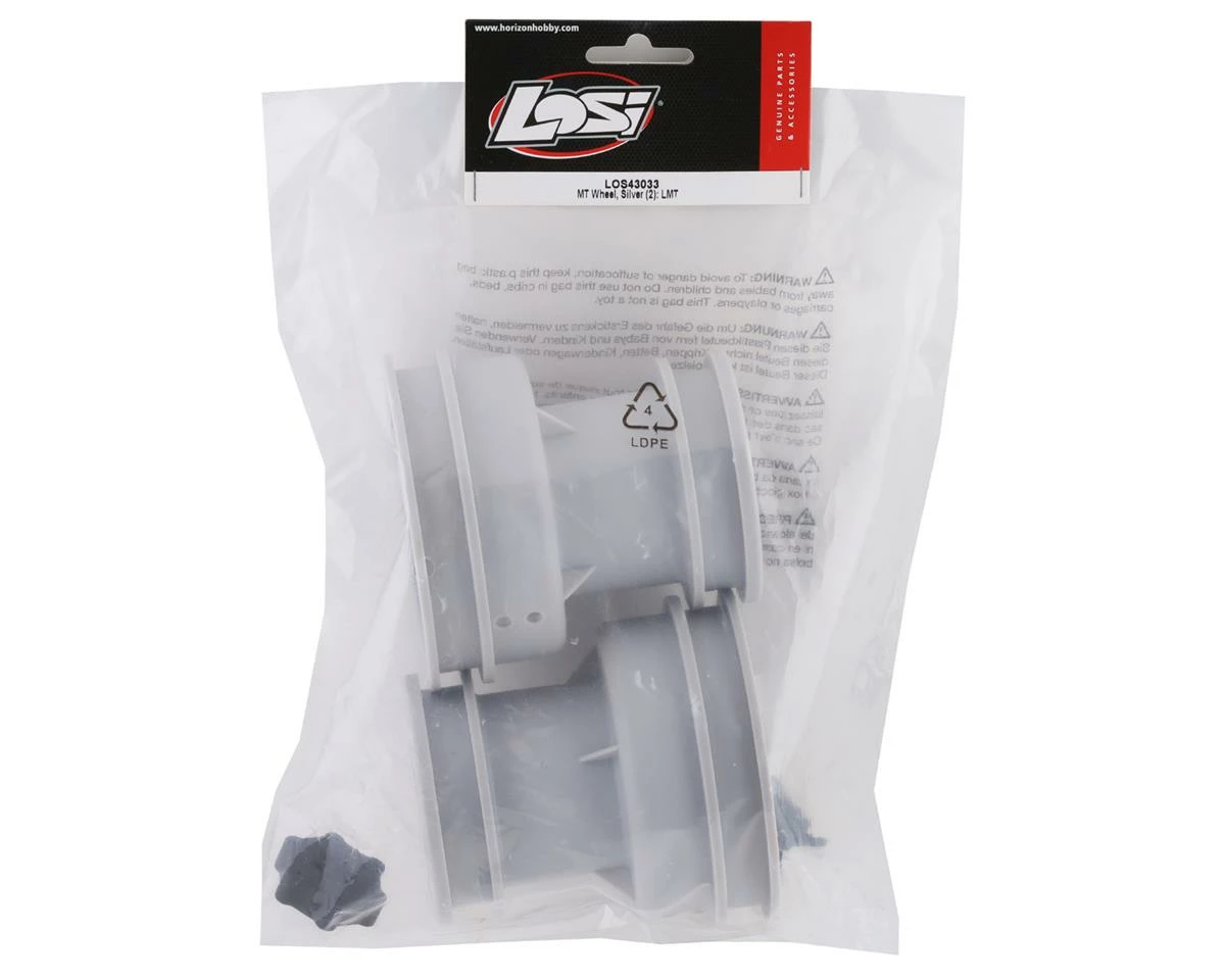 This is a pack of two Losi Monster Truck Wheels in Silver color, for use with the LMT Monster Truck. These wheels also include four hex adapters, plus hardware.