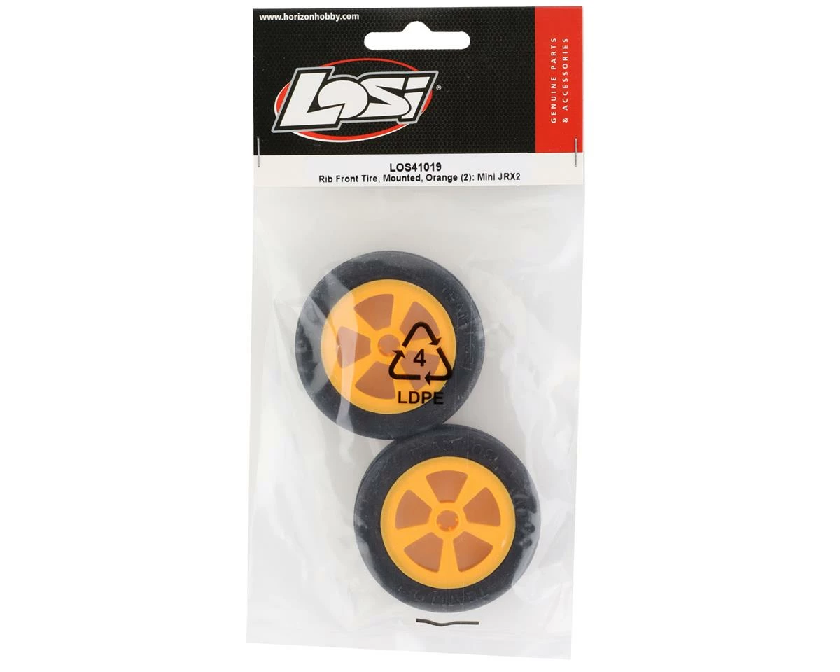 Losi Mini JRX2 Pre-Mounted Front Rib Tire. These replacement front rib tires come pre-mounted for the Losi Mini JRX2 Buggy. Package includes two pre-mounted front rib tires.