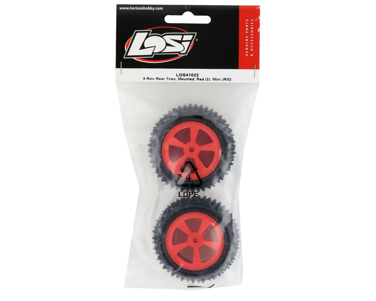Losi Mini JRX2 Pre-Mounted Rear 4 Row Tire Set. These replacement rear 4 row tires come pre-mounted for the Losi Mini JRX2 Buggy. Package includes two pre-mounted rear 4 row tires.