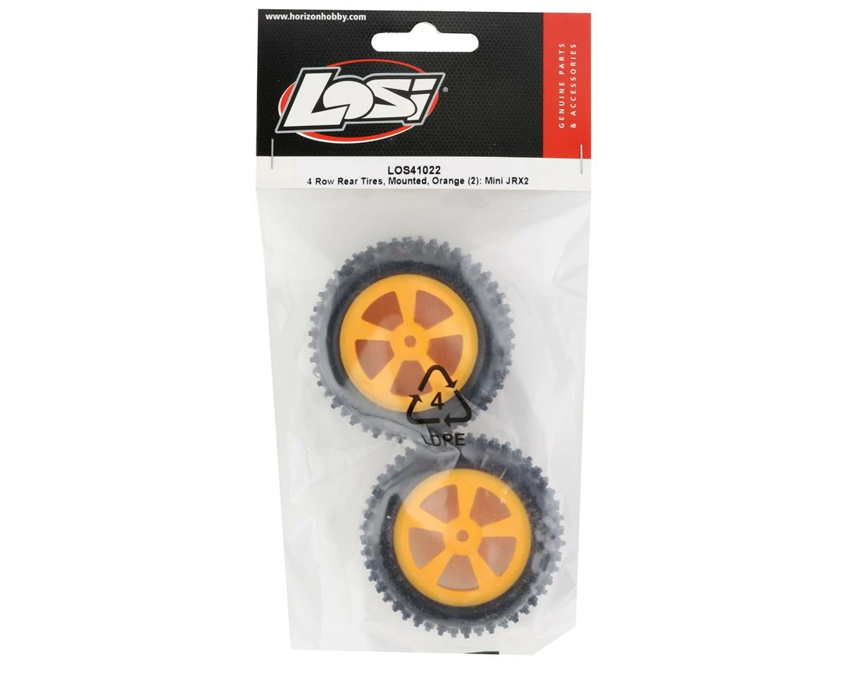 Losi Mini JRX2 Pre-Mounted Rear 4 Row Tire Set. These replacement rear 4 row tires come pre-mounted for the Losi Mini JRX2 Buggy. Package includes two pre-mounted rear 4 row tires.
