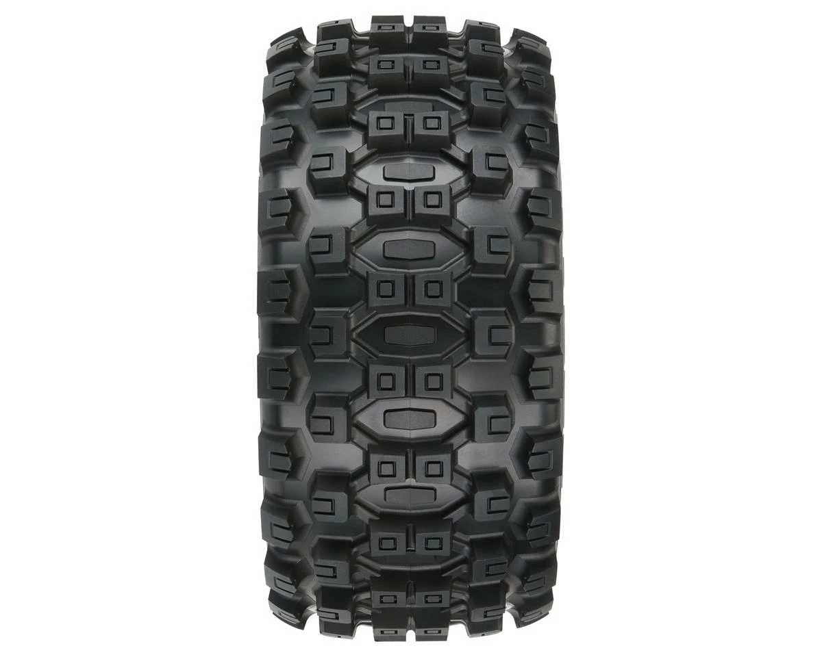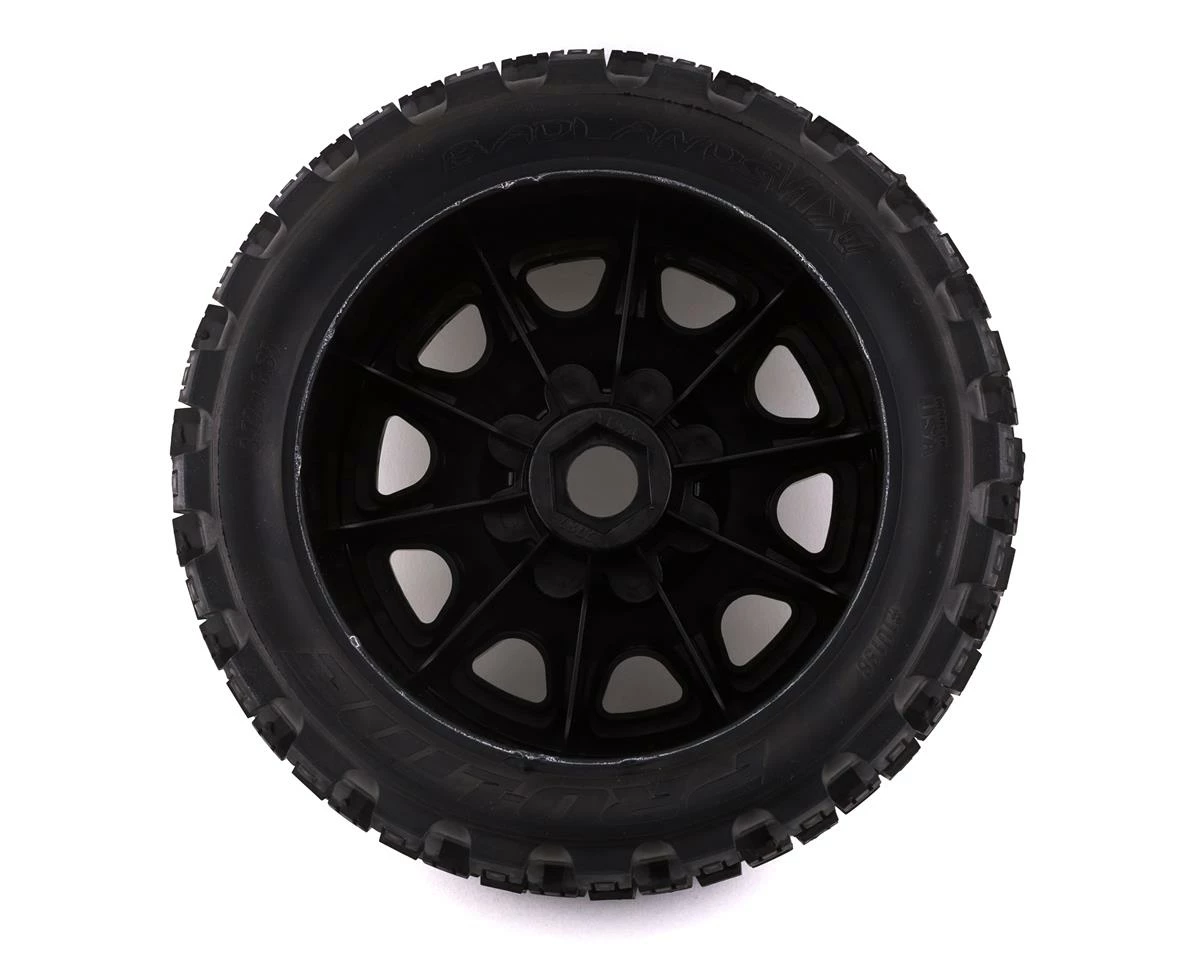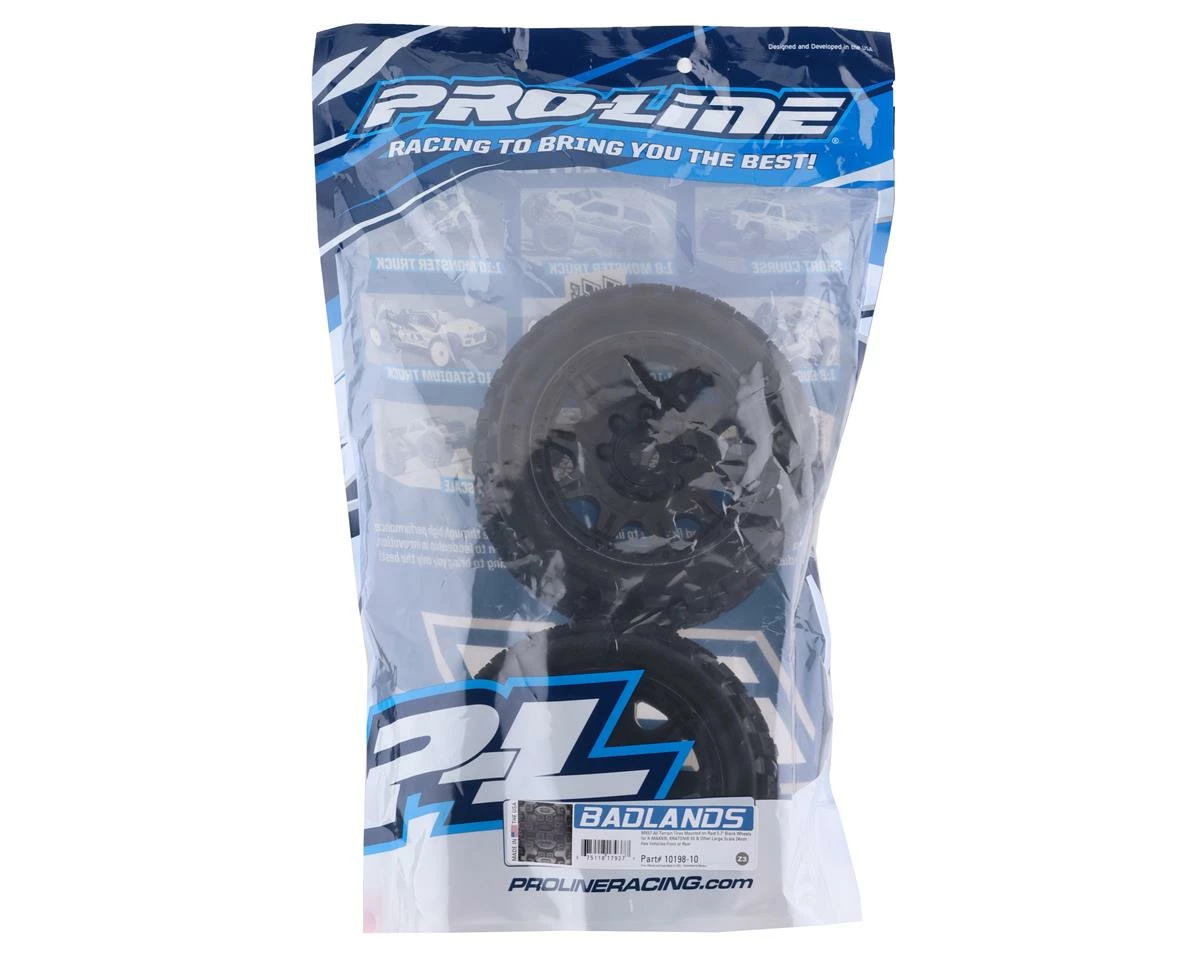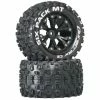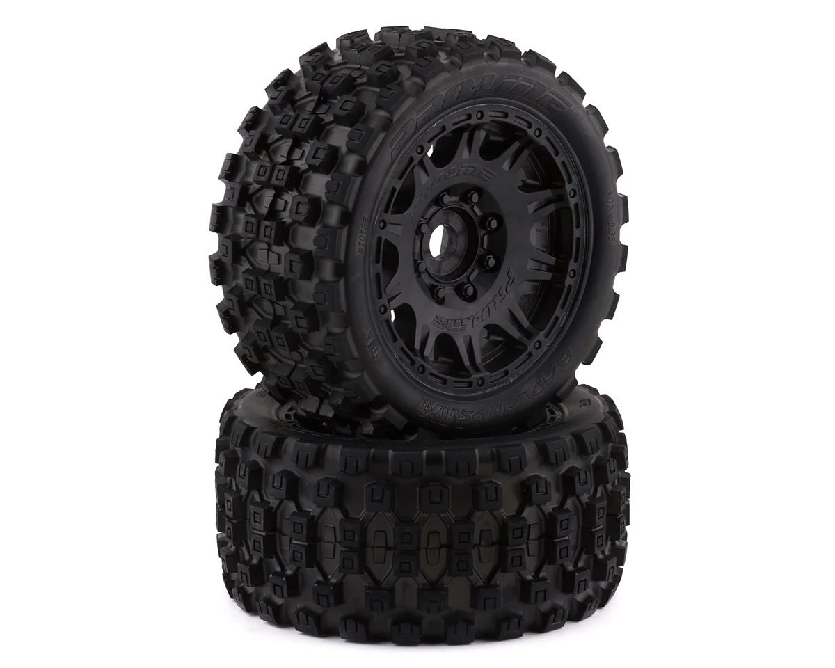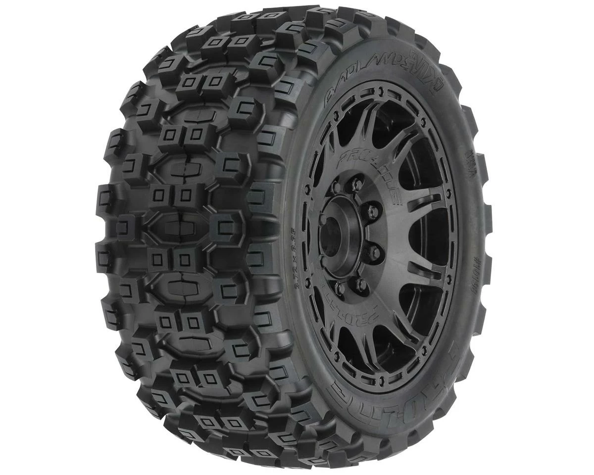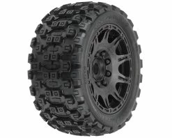 Pro-Line Badlands MX57 5.7″ Pre-Mounted 1/6 Monster Truck Tires with Raid Wheels. These Badlands are based on the MX43 tire and features the same aggressive tread combination. Now mounted on the Raid wheels, these tire and wheels weigh 20% less than prior models. Pro-Line Badlands tires are known for having a sweet Motocross inspired tread and the Badlands MX57 tires kick that up a notch with a Bigger and Bolder knobby tread that matches modern MX tire design.
