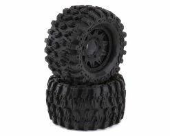 The Pro-Line Hyrax 2.8″ Pre-Mounted Tires with Raid Rear Wheels is a great option for loose or hard-packed dirt, sand, snow, street, or gravel! The Raid 2.8″ wheels feature removable hexes to allow for different offsets. Using the included narrow hex will allow for use on the rear of the Traxxas Rustler or Stampede 2WD, while the included wide hex will allow for the front of the Rustler or Stampede 2WD. The wide offset hex is also great for the front or rear of the Traxxas Rustler or Stampede 4WD. If Arrma vehicles are more your speed, you can purchase the optional 14mm hexes (PRO6347-00). Package includes two pre-mounted tires, two narrow hexes, two wide hexes and hardware.