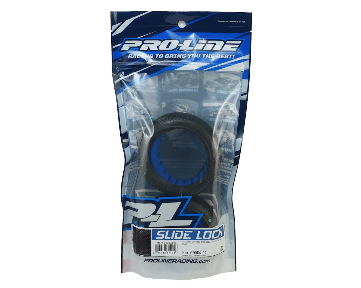 The Pro-Line Slide Lock 1/8 Buggy Tire was developed specifically for smooth, low grip tracks. The Slide Lock features a pattern of small, tightly packed hexagon and triangle shaped pins so you can lay down as much rubber as possible. The tread is laid out wider across the tire carcass for a flatter profile overall compared to other Pro-Line 1:8 Race Tires. Each hexagon pin has a deep sipe down the middle of the tread for added flex and grip on even the slickest of surfaces. The built-in tread flex means you can run harder compounds for longer wear and still have good traction when you need it. The large and stiff side pins reach far down the sidewall to reduce edginess as much as possible.