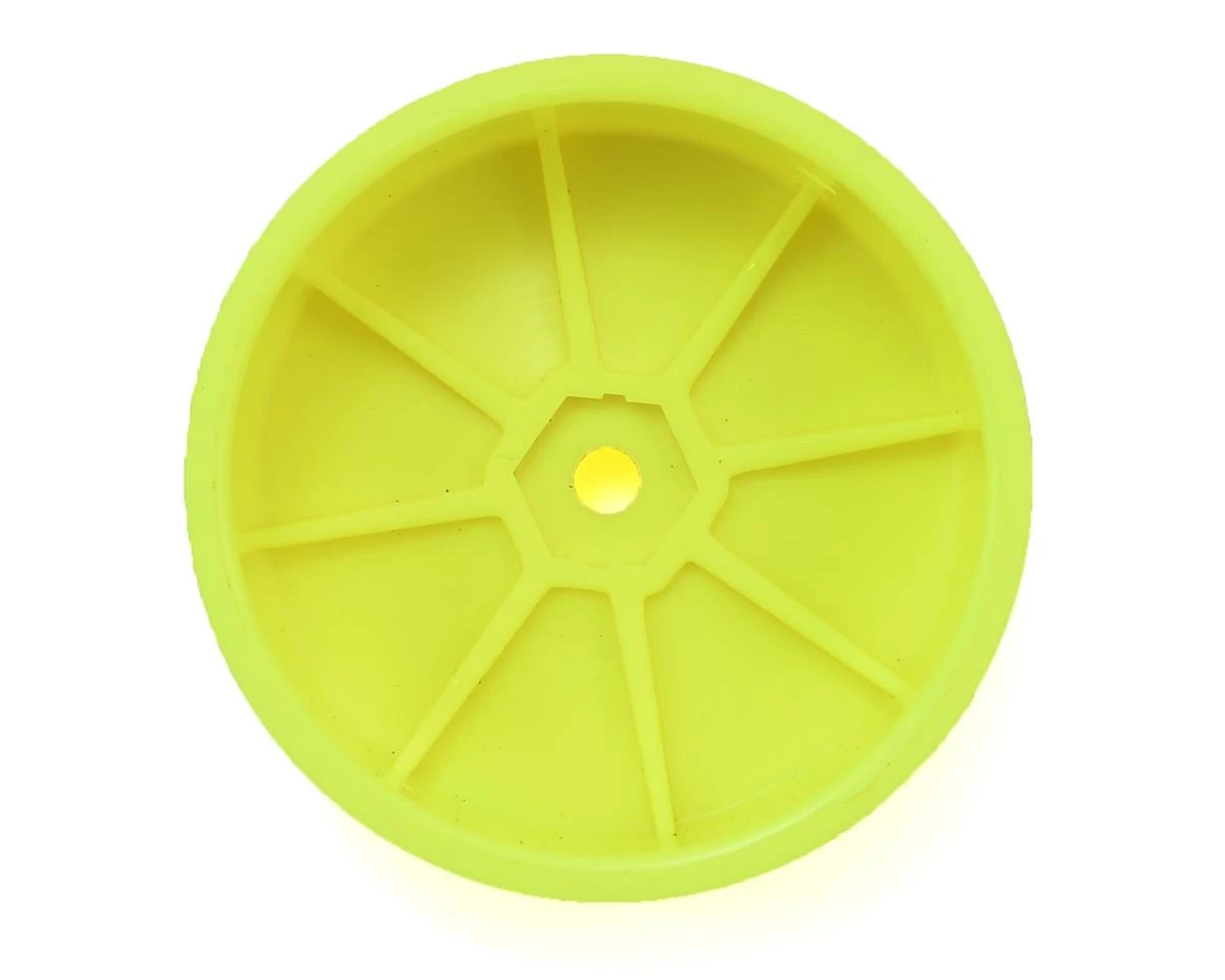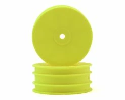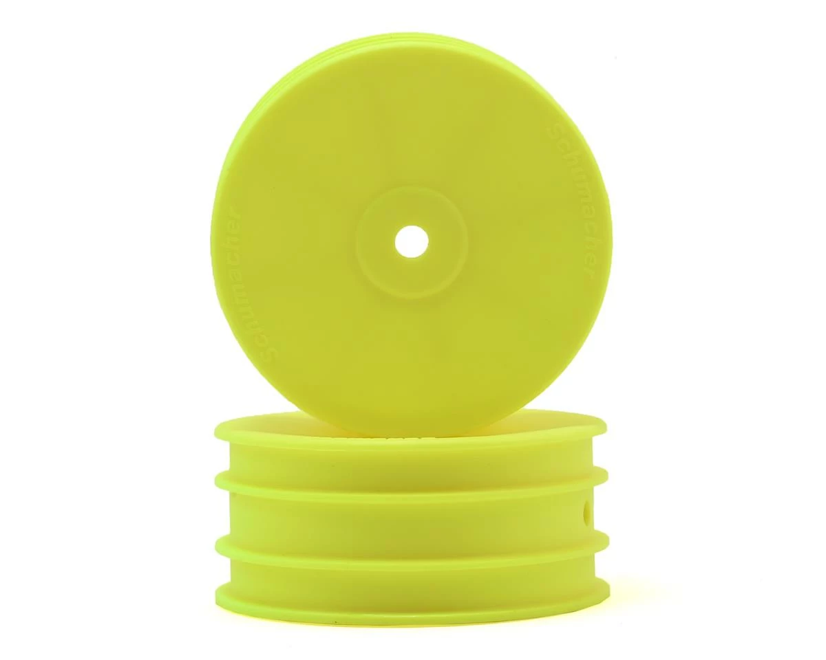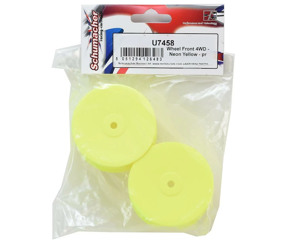 Schumacher 1/10 4WD Front Buggy Wheels. These 4WD front wheels are 27mm wide and feature a 12mm hex drive. These wheels are recommended for front 4wd use. Package includes two yellow wheels.