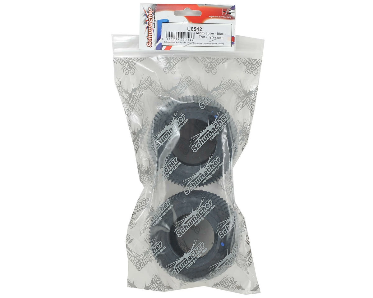 This is a pair of Schumacher “Micro Spike” 2.2 1/10 Rear Truck Tires. The Micro Spike is most suitable for indoor carpet tracks.