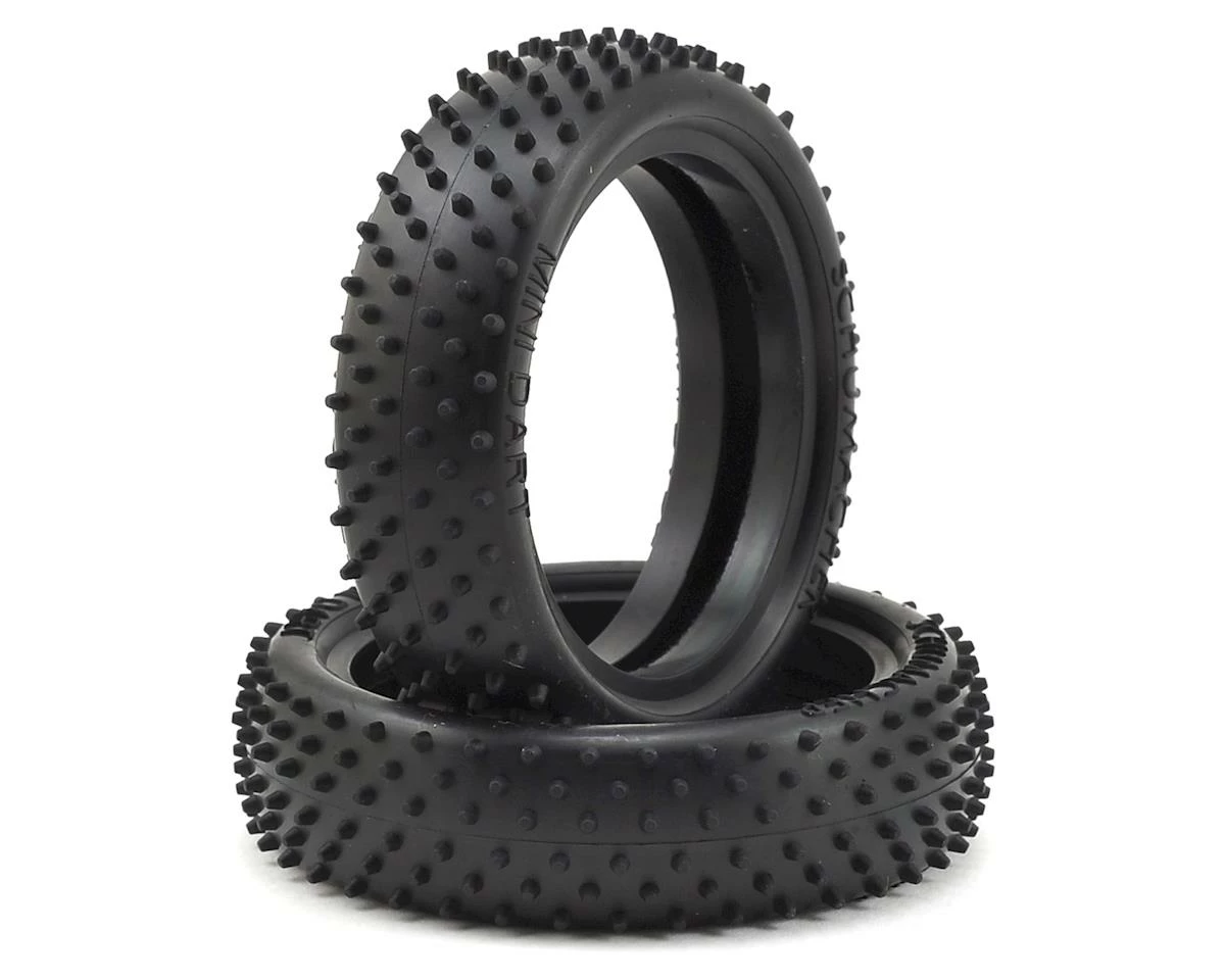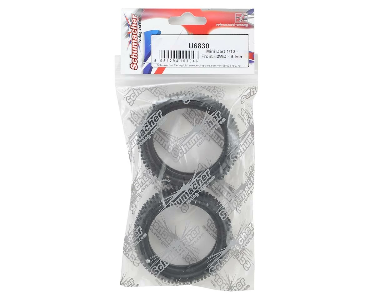 The Schumacher “Mini Dart” 2.2″ 2WD Buggy Front Carpet Tire was developed as a low profile turf tire that provides improved bump handling and reduced traction roll on high grip astro and carpet tracks. Midway between a mini pin and mini spike, the Mini Dart is BRCA legal width with less side overhang, and extremely versatile. The high performance and long life make it a great option for control tire racing.