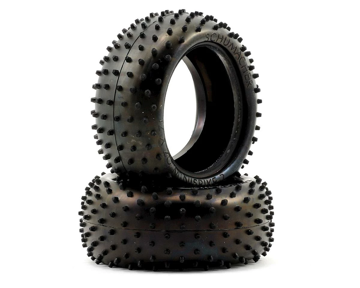 This is a set of two Schumacher “Mini Spike 2” 2.2 1/10 Buggy Rear Tires. The Schumacher Mini Spike 2 tire is the control tire used for a majority of races in the UK, making it an excellent choice for a variety of outdoor track conditions.