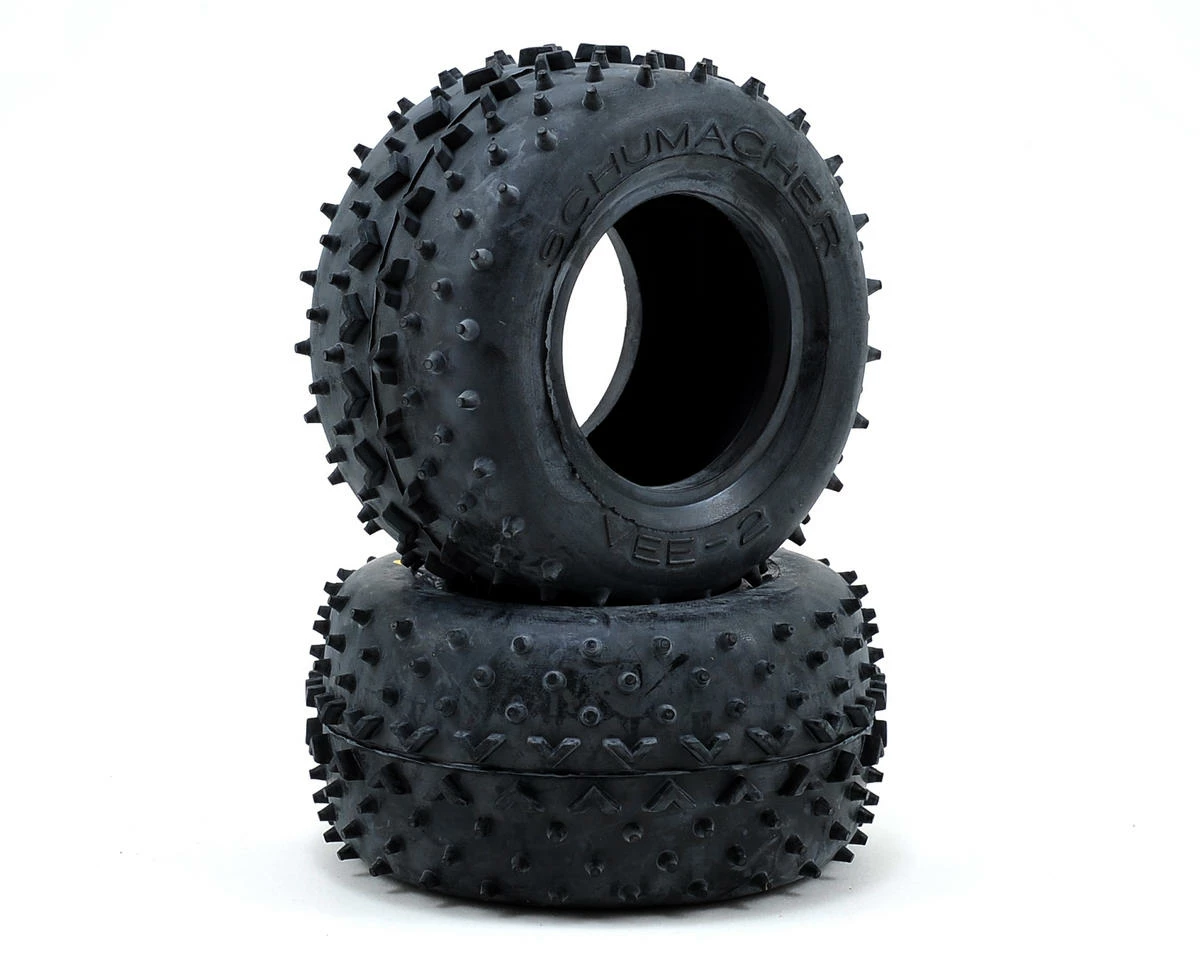 This is a pack of two Schumacher “Vee 2″ 2.2” 1/10 Scale Stadium Truck Rear Tires, in Yellow rubber compound. These “Vee 2” tires feature a nobby design towards the outside with ‘V’ shaped nobbies on the inside.