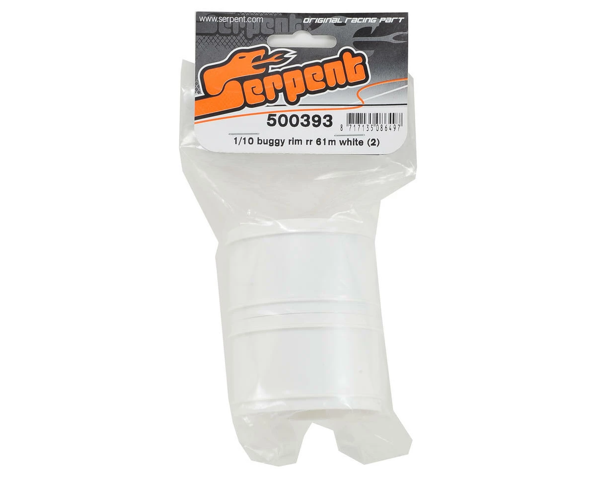 This is a pack of two Serpent 61mm Rear 1/10 Buggy Wheels, in White color. These wheels are 61mm in diameter and feature a 12mm hex. These wheels also feature an “L” shaped glue bead, making traditional 2.2 tires not compatible. Please purchase the appropriate tires for these wheels.