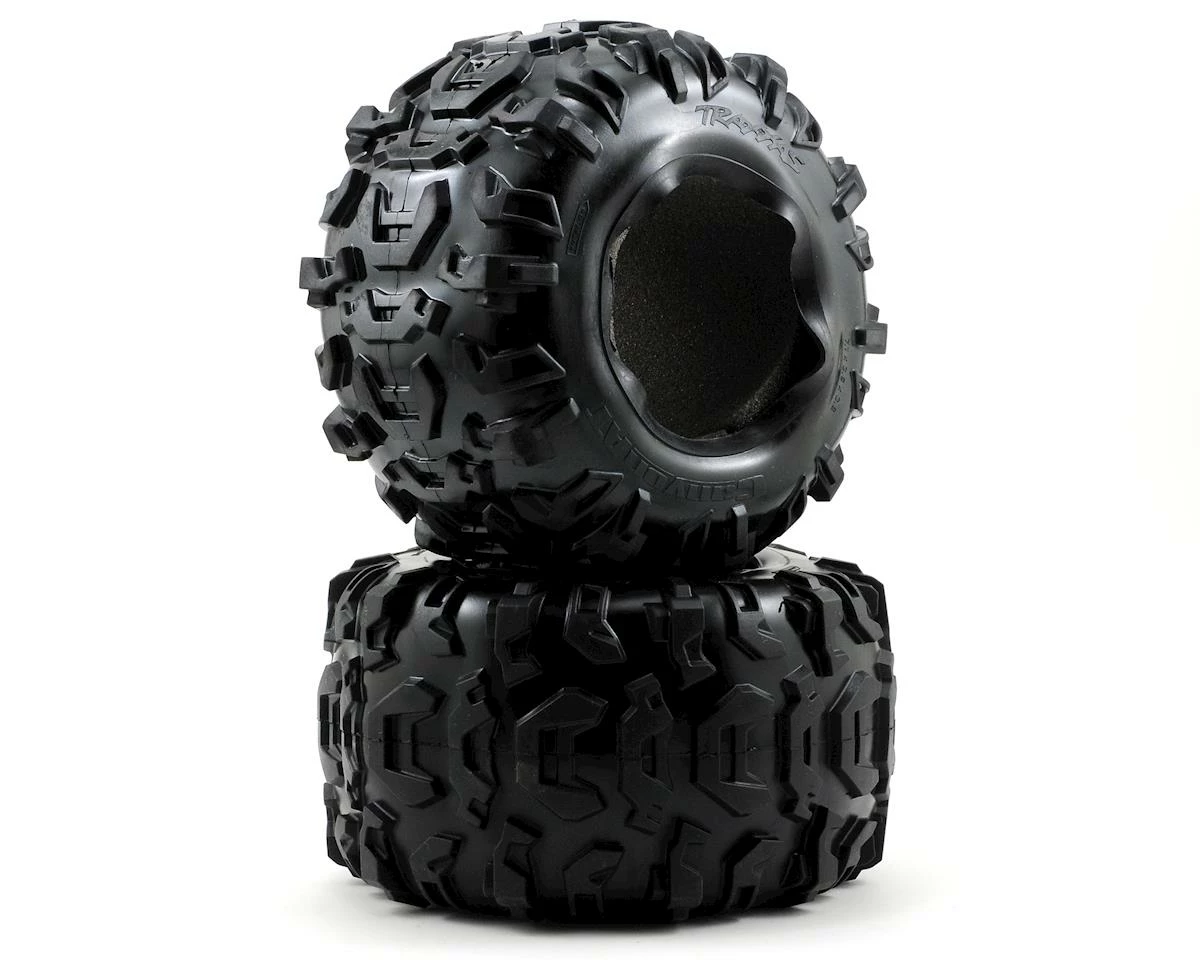 This is a set of two Traxxas 3.8″ Canyon tires with foam inserts. These are the tires that come stock with the Traxxas Summit Monster Truck.