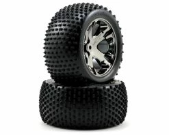 This is a set of two premounted Traxxas Alias Rear tires, mounted on All Star wheels. Choose from Black Chrome or Chrome finish.
