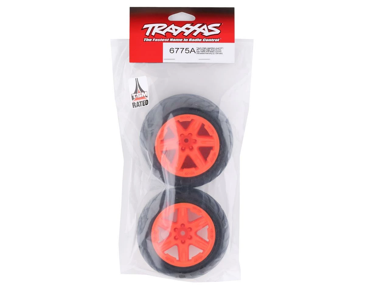 Traxxas Anaconda 2.8″ Pre-Mounted Tires with RXT Wheels. Anaconda performance street tires feature a specially formulated tire compound providing a long lasting traction. These tires are mounted and pre-glued on tough RXT orange wheels. Molded-foam inserts coupled with the directional tread design provide a balanced feel for the ultimate high-speed on-road experience. These optional pre-mounts may be used on the front of the Traxxas Rustler 2WD and the front or rear of the Traxxas Rustler 4×4. Package includes two pre-mounted tires.