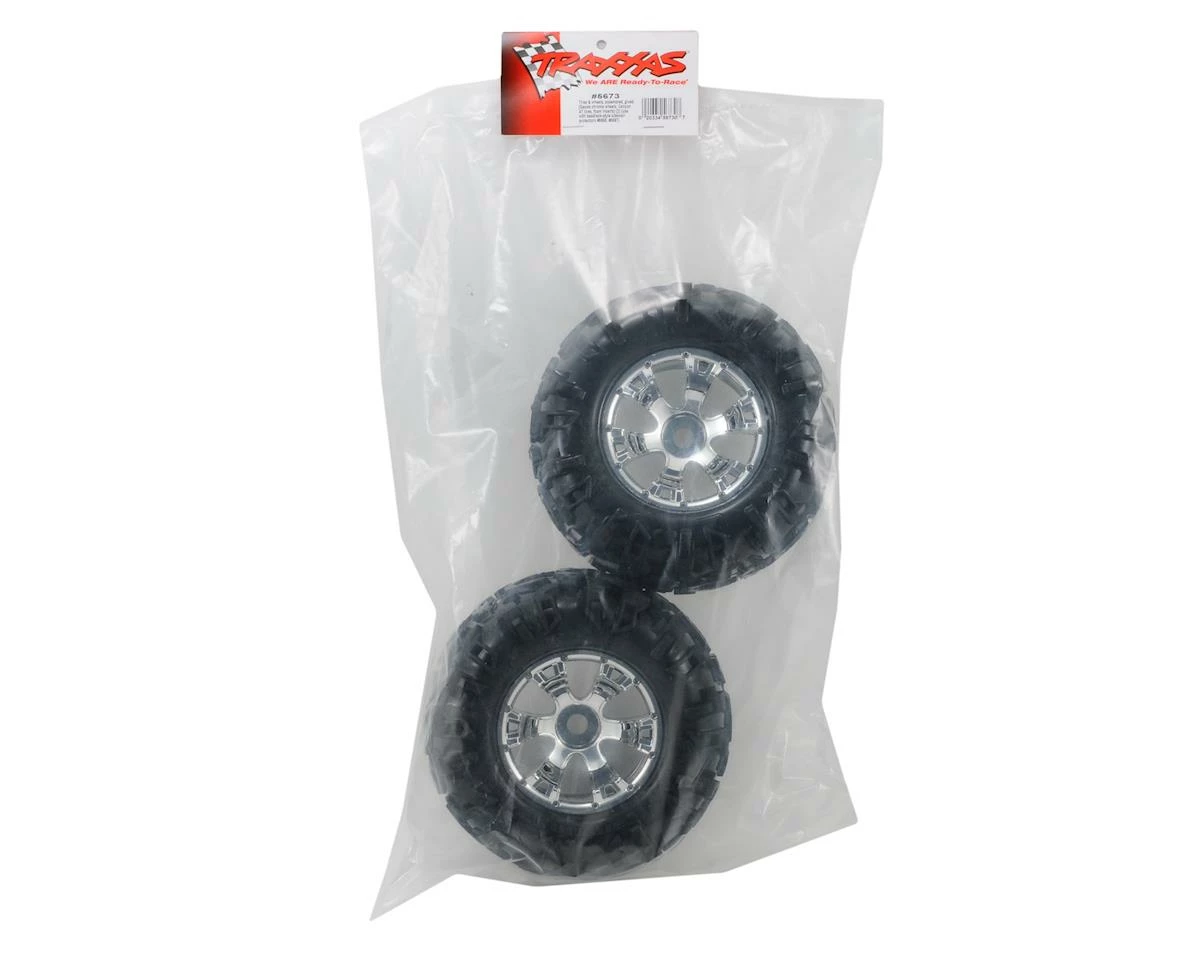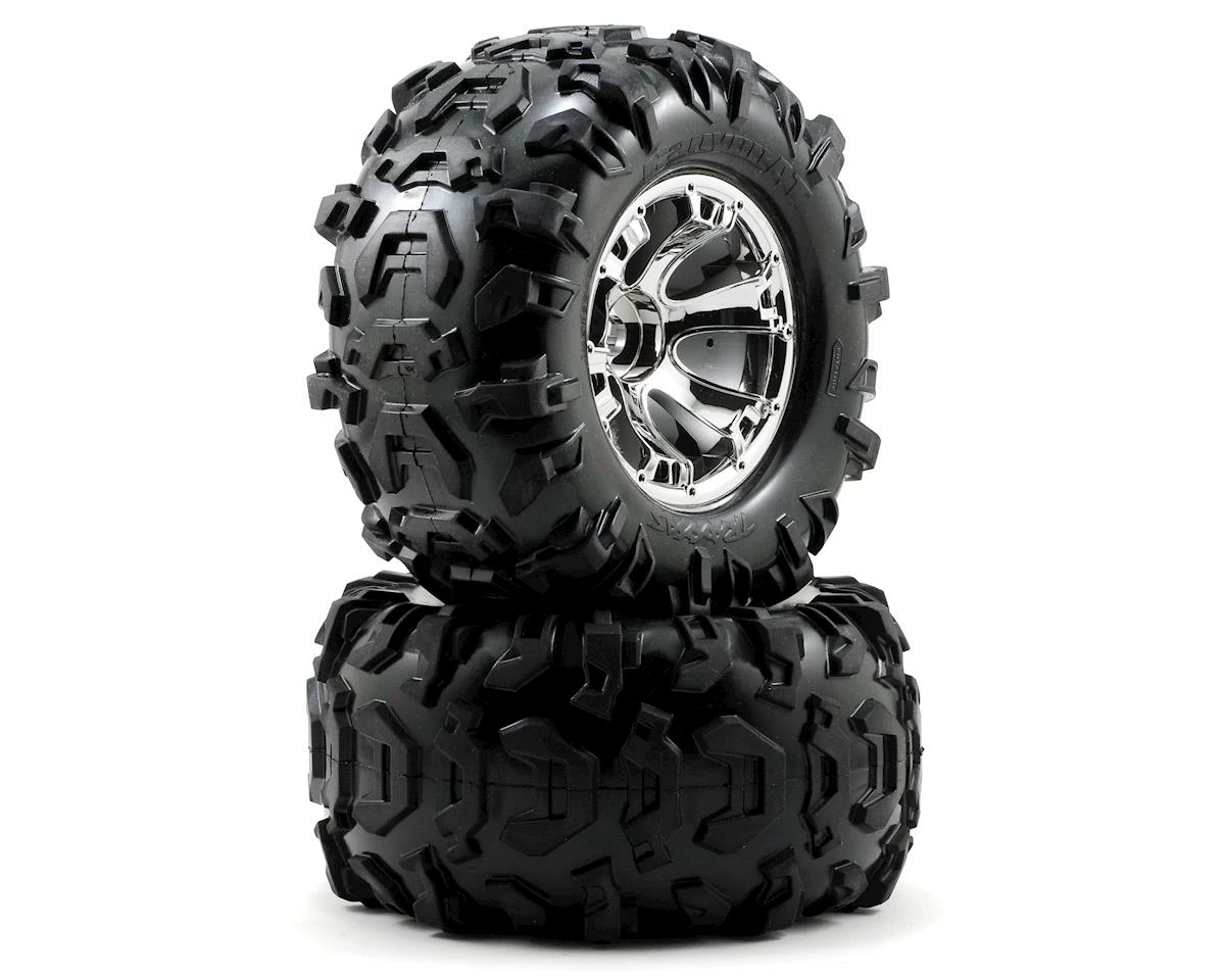 This is a set of two Traxxas Canyon AT Tires, Pre-Mounted on Geode Chrome Wheels, intended for use with the Traxxas Summit Monster Truck.