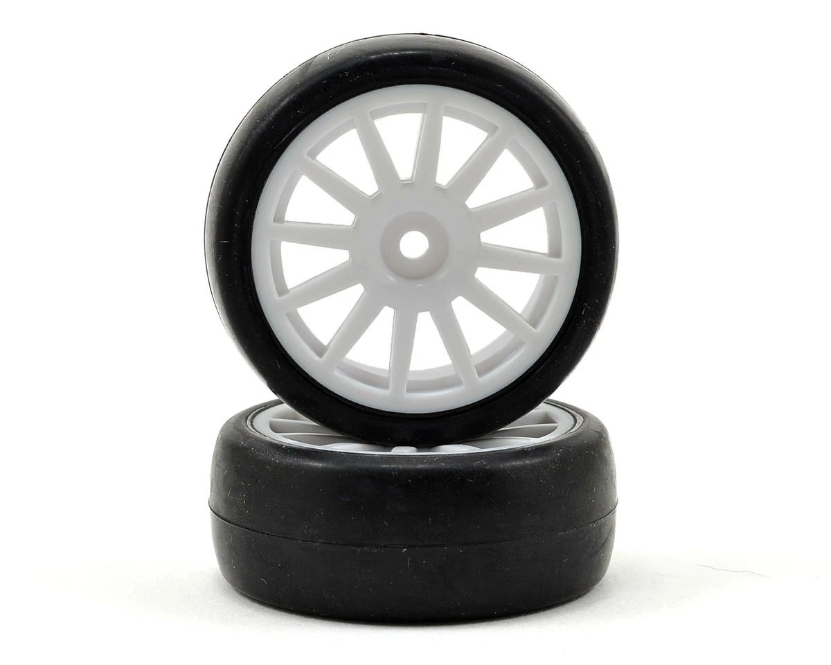 This is a pack of two replacement LaTrax Pre-Mounted Slick Tires on 12-Spoke White Wheels. These wheels are used on the front and rear of the vehicle.