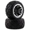 This is a pack of two Traxxas Talon Rear Tires, premounted on All Star wheels. The Traxxas 2.8″ Talon tires are the most versatile all-terrain tires available for your Traxxas model. The directional long-wear tread pattern provides extended tire life, while providing exceptional traction on most any surface. The 2.8″ Talon integrates a soft rubber compound, large foam inserts, and a go-anywhere design that allows it to excel on asphalt as well as rocks, grass, dirt, or any other surface. The tapered tread design where the treads meet the sidewall enables the tire to slide on asphalt, to help avoid unwanted traction rolls. Increase the ride height and ground clearance of any Traxxas stadium truck by adding a set 2.8″ Talon tires.*